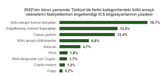 Diğer bölgeler ile kıyaslandığında Türkiye’de 2022’nin ikinci yarısında casus yazılımların engellendiği ICS bilgisayarlarının oranı %12,4 ile yüksek oranda gerçekleşti. Türkiye’deki ICS’lerde engellenen diğer kötü amaçlı yazılım kategorilerine bakıldığında, kötü amaçlı komut dosyaları ve reddedilen internet kaynakları %19,7 ve %13,0 oranlarıyla listenin başında yer alıyor.